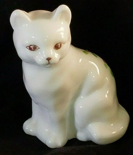 Title (ebay affiliate link): Fenton Sitting Cat Art Glass Hand Painted Violets On White Milk Glass D. Owens