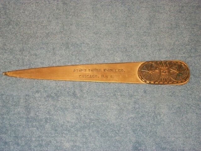 Vintage 9" Brass Letter Opener Athey Truss Wheel Co Chicago Illinois 1929-1953