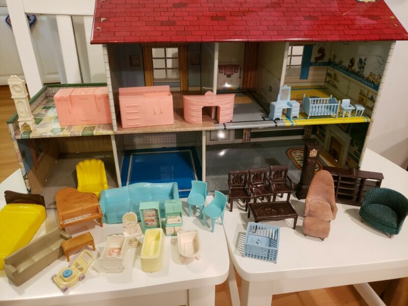 Title (ebay affiliate link): ADORABLE/RARE-VINTAGE 50''S MARX METAL DOLLHOUSE W/FURNITURE-GREAT CONDITION-NR