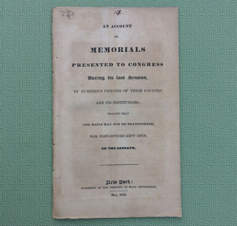 1829 MEMORIALS TO CONGRESS THAT MAILS MAY NOT BE TRANSPORTED ON THE SABBATH