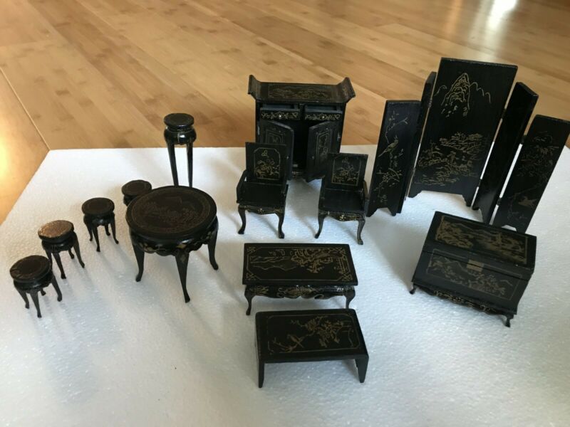Title (ebay affiliate link): Vintage 12 Piece Oriental Black and Gold Dollhouse Miniature Furniture Set