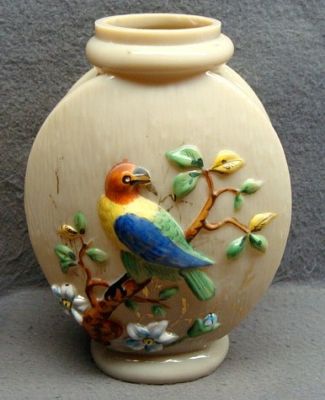Rare Victorian Almond Milk Glass Vase With Raised Bird