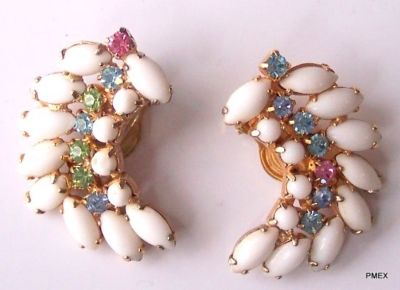 Vintage Earrings MILK WHITE Glass Salad Rhinestone Clip
