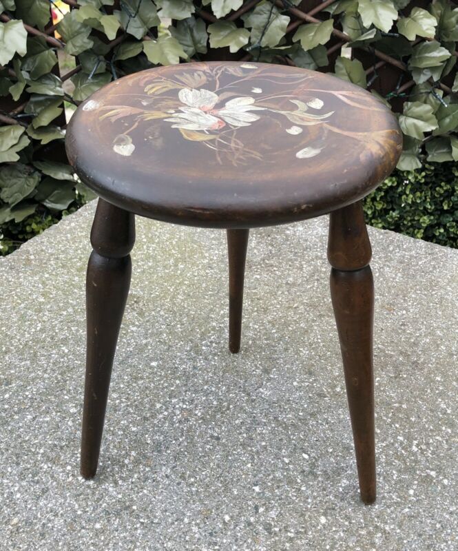 ANTIQUE VINTAGE WOODEN FARMHOUSE MILKING STOOL HAND PAINTED FLOWERS DECORATION