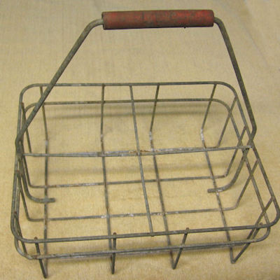 Vtg Wire Cage Glass Milk Bottle Basket Crate Red Handle