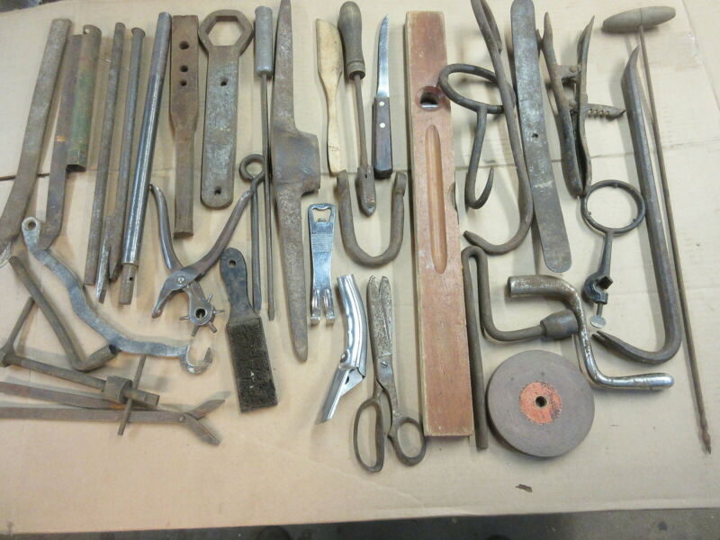 lot of vintage hand tools & odd iron crow bar level tire irons hay hooks, pick