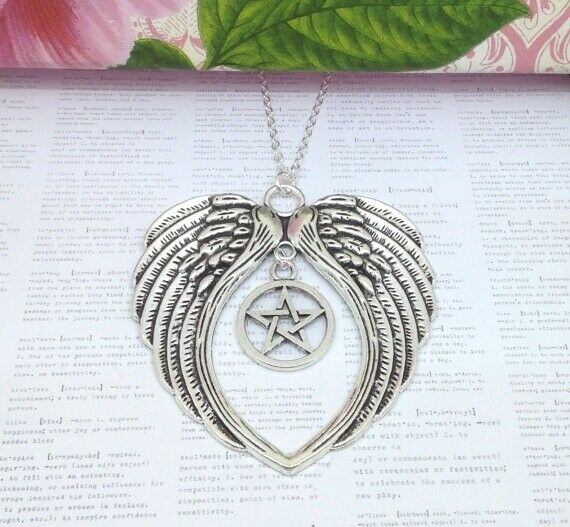 Title (ebay affiliate link): jewelry Large Antique Silver Double Guardian Angel Wing Necklace Star Pentacle