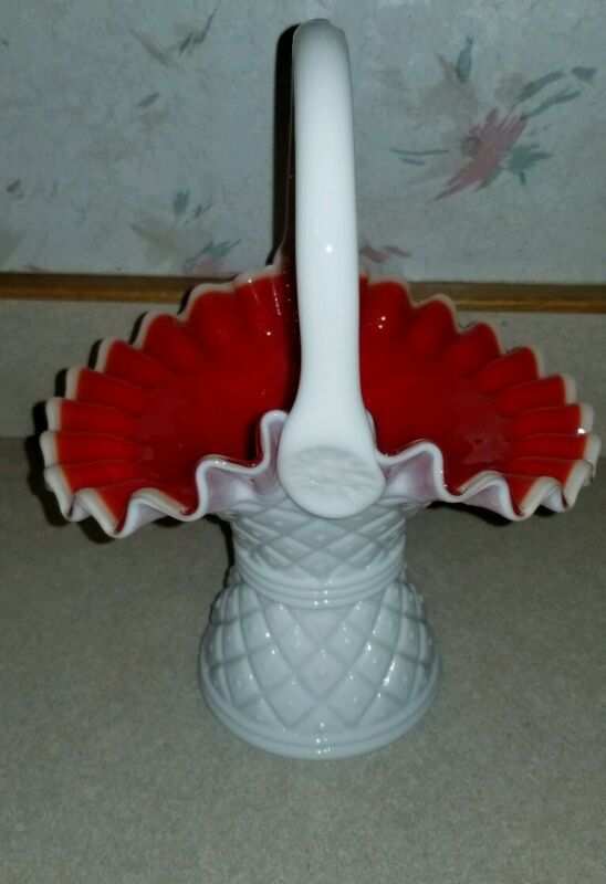 Title (ebay affiliate link): Vintage Fenton Red & White Milk Glass Basket Diamond Hobnail Ruffled Edges