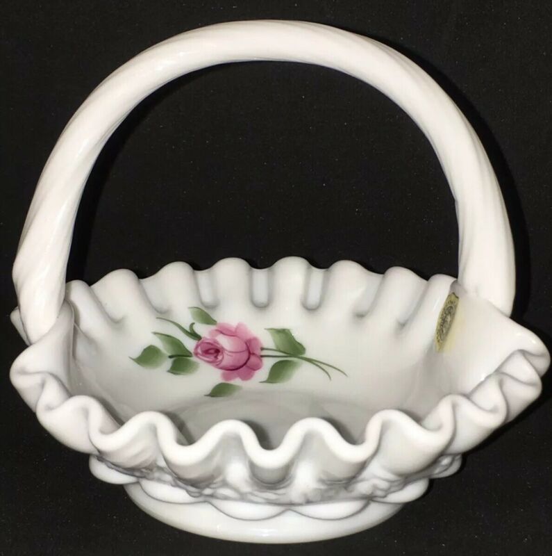 Title (ebay affiliate link): Westmoreland Hand Painted Rose Basket with Crimped Rim Milk Glass