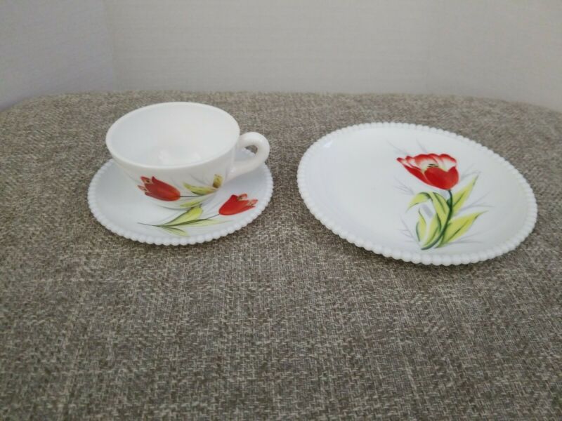 Milk Glass Beaded Edge Flower Plate, Teacup And Saucer