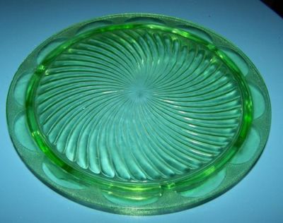 VINTAGE GREEN DEPRESSION GLASS CAKE PLATE SWIRL