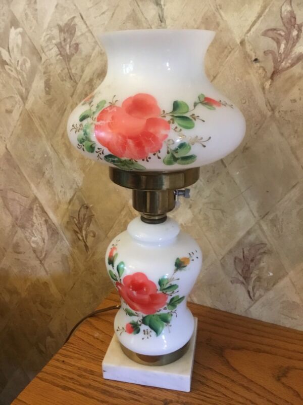 Title (ebay affiliate link): VINTAGE MILK GLASS TABLE LAMP Hand Painted Rose Marble BASE Hurricane Light