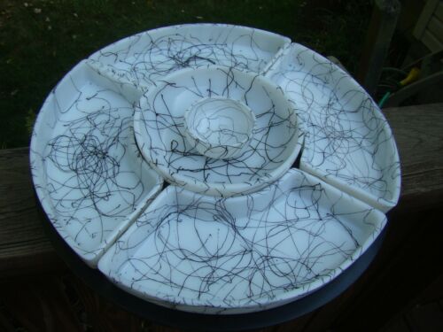 Vintage Hazel Atlas Black Drizzle Spaghetti Milk Glass Relish Tray Lazy Susan
