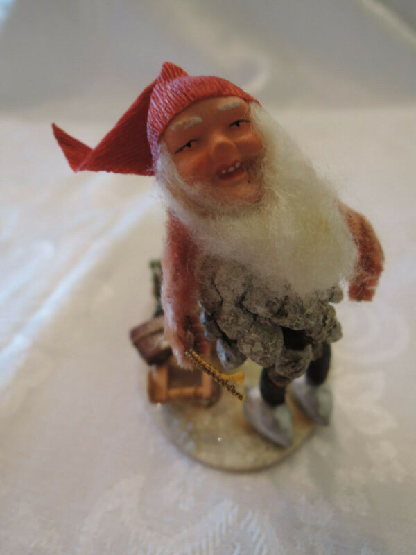 Title (ebay affiliate link): vintage German Christmas pinecone gnome, composition face, mica with sled