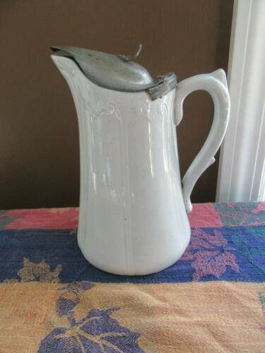 Vintage 1880''s White Ironstone Syrup Pitcher with Pewter Lid 6 1/2"