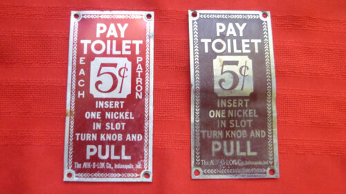 Title (ebay affiliate link): (2) Two Vintage Pay Toilet 5 cents Metal Signs The Nik-O-Lok Co.