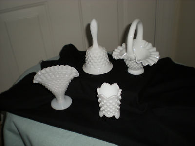 4, Hobnail Milk Glass, Basket,Fan Vase,Bell & Toothpick