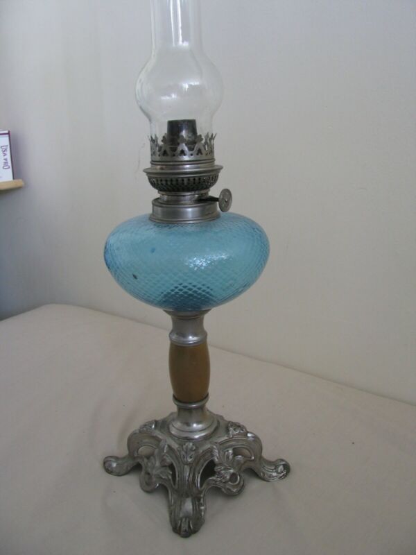 Title (ebay affiliate link): Vintage Oil Lamp French Blue Glass Font with Chimney