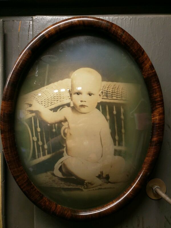 Antique Oval Tiger Wood Frame Convex Bubble Glass w/Photo of Infant