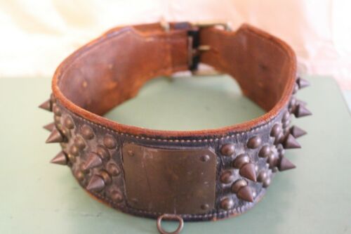Title (ebay affiliate link): Antique Dog Collar Leather Brass Spikes & Studs Brass Name Plate Macho Look Old