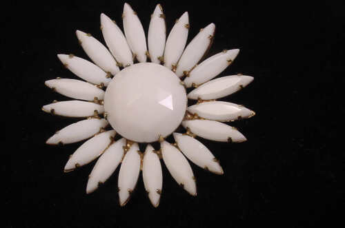 Title (ebay affiliate link): Vintage Navette Milk Glass Floral Flower White Brooch Prong Set Faceted Stone