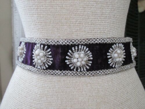 Antique Victorian Royal Plum Velvet Milk Glass Sunburst Bead Buckled Sash,Belt