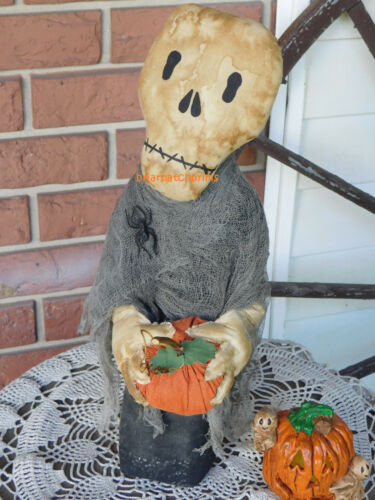Primitive Halloween Skeleton Doll w his Pumpkin Fall Decoration Folk Art