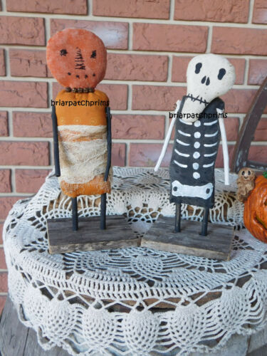 Title (ebay affiliate link): Primitive Pair of Halloween Skel & Pumpkin Doll Shelf Sitters Fall Decoration