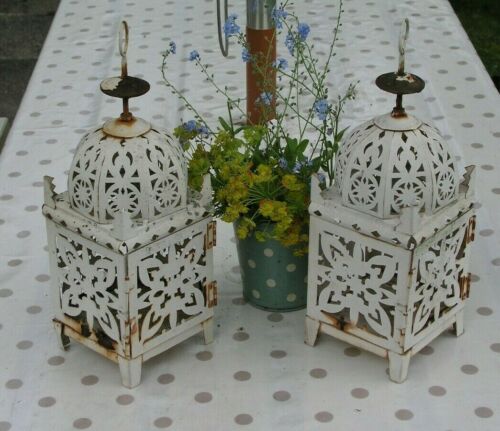 VINTAGE PAIR OF LARGE CREAM METAL LANTERN CANDLE HOLDER RUSTY
