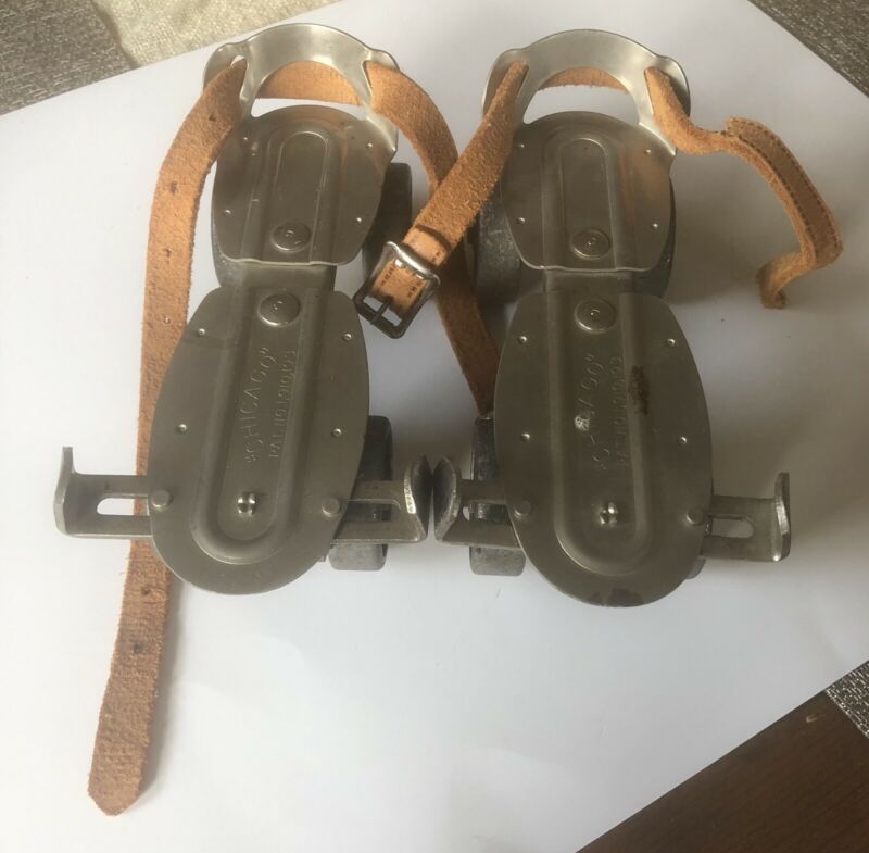 Title (ebay affiliate link): Vintage 1950s Chicago Roller Skate Co. Metal Skates w/ Leather Straps Adjustable