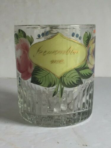 Title (ebay affiliate link): Antique American Pattern Mold Blown Glass Mug Enamel Painted REMEMBER ME Handled