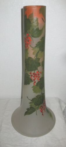Antique LEUNE Signed ART GLASS VASE Hand Painted IVY & BERRIES French Very Large
