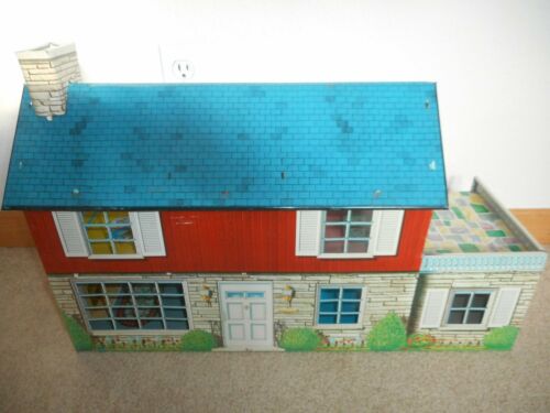 Title (ebay affiliate link): Marx Two Story Metal Lithro Dollhouse with utility room and some furniture.