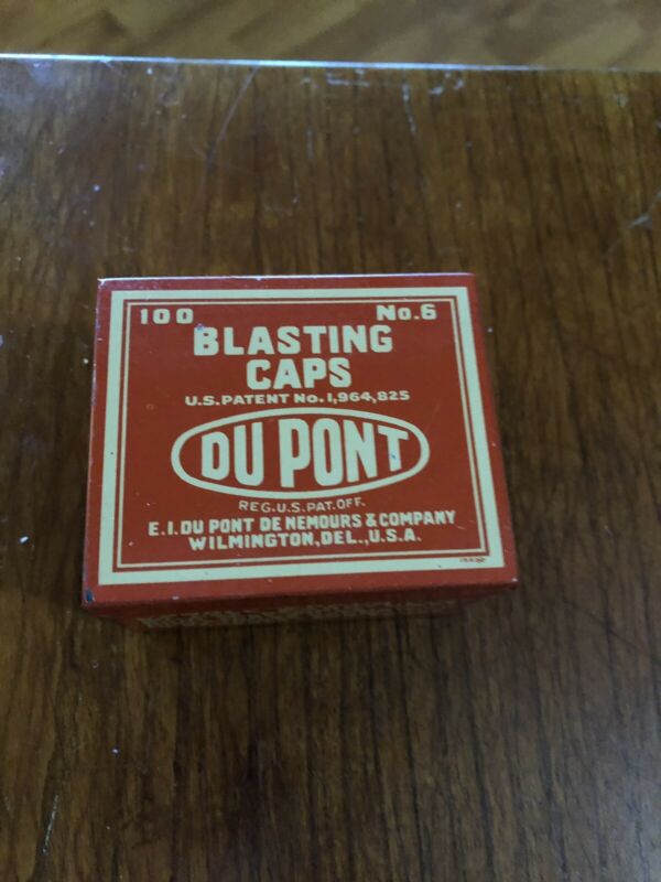 Title (ebay affiliate link): Vtg. Original No. 6 Du Pont 100 Ct. Blasting Caps Tin Box Empty/Bright Graphics