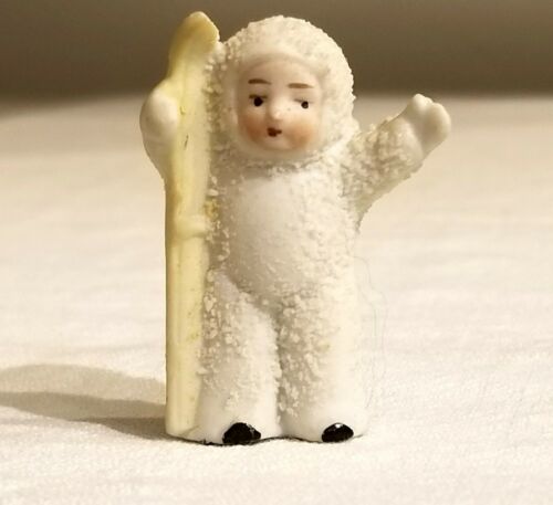 Title (ebay affiliate link): Miniature Bisque Snow Baby, holding Skis, One Hand Up. German. Early 1900s