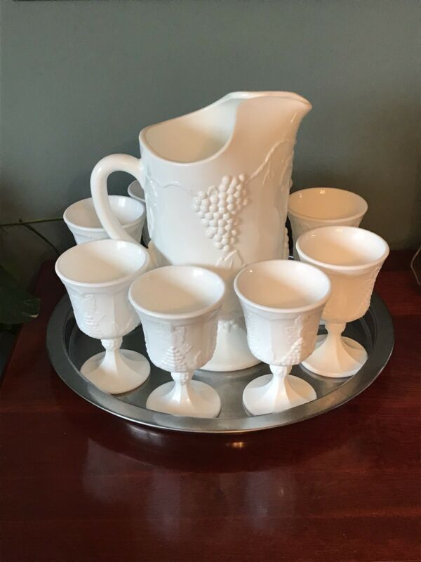 Milk Glass Pitcher And 8 Goblets - Grape Vine Motif