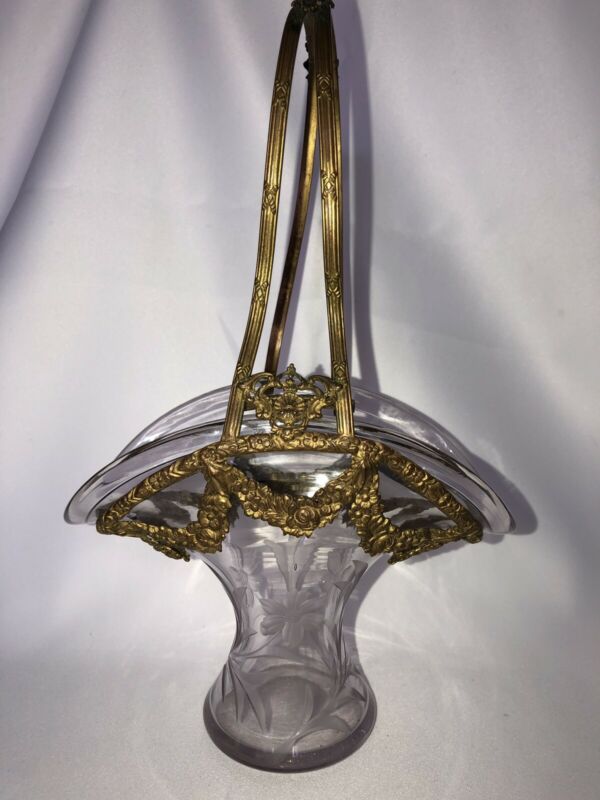 Antique Gilt Dore Bronze Floral Swag Mount Cut Glass Basket