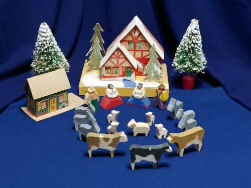 Antique Putz Cardboard Winter Scene Farm Animals People Wood night light holders