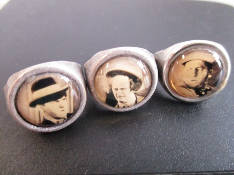Title (ebay affiliate link): THE THREE STOOGES RINGS SET MOE , LARRY & CURLY LOT OF 3 ADJUSTABLE METAL RINGS