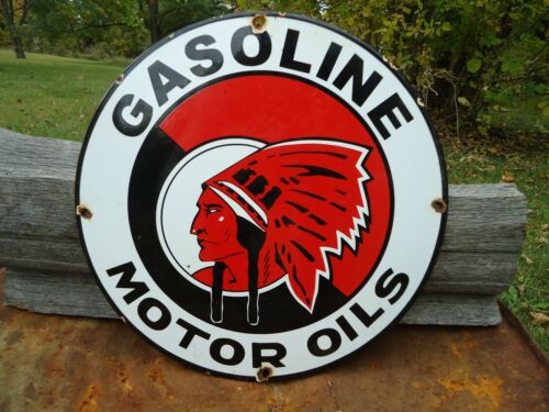 Title (ebay affiliate link): VINTAGE OLD CHIEF GASOLINE AND OIL PORCELAIN GAS PUMP SIGN INDIAN