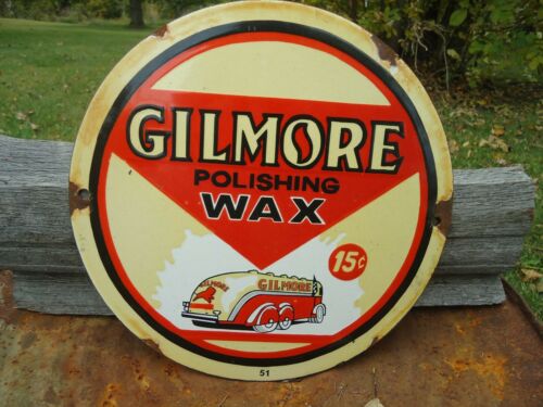 Title (ebay affiliate link): DATED 1951 GILMORE POLISHING WAX 15 CENTS PORCELAIN PUMP SIGN