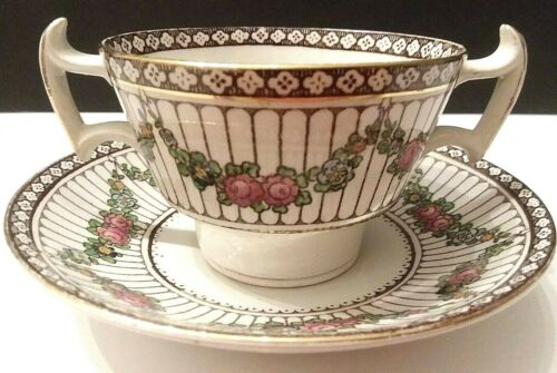 Title (ebay affiliate link): Antique Booths Silicon China Two-handled broth/tea cup/saucer c.1906+ Art Deco