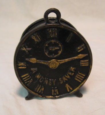 Title (ebay affiliate link): Antique Cast Iron A Money Saver Alarm Clock Still Bank