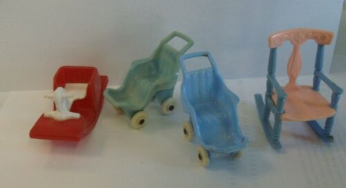 Title (ebay affiliate link): 4 Pcs Vintage Hard Plastic Dollhouse Furniture Baby Strollers, Rocking Horse & C