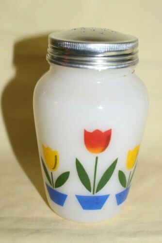 Title (ebay affiliate link): Vintage Anchor Hocking Fire King White Milkglass Tulip Shaker w/New Lid