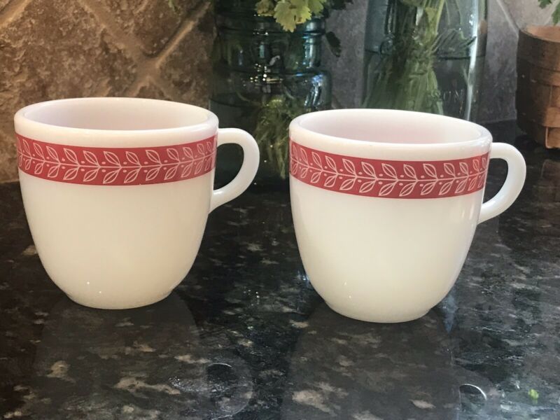 Vintage Pyrex ~ Laurel Leaf Red ~ Milk Glass Coffee Cup ~ Set Of 2