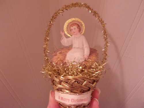 Title (ebay affiliate link): Antique Look Christmas Ornament, CHRIST Child SCRAP, Basket, Tinsel, Handmade