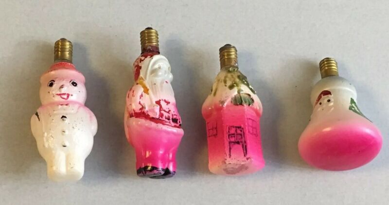 Vintage Set of 4 Glass Christmas Figural Lights Santa Claus Bell House Snowman
