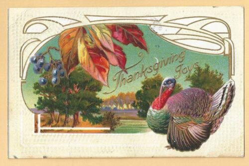 Vintage Thanksgiving Embossed Postcard, Turkey, Grapes, Gold Foil Inlay