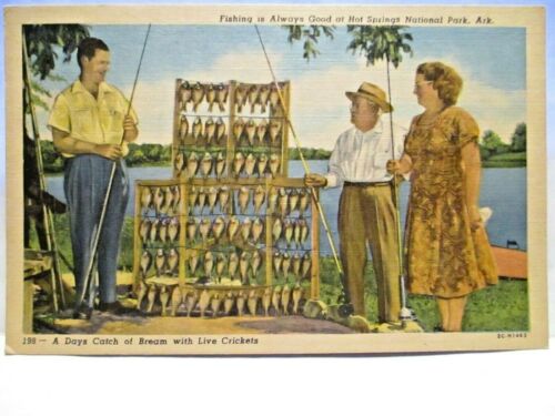 Title (ebay affiliate link): 1940s POSTCARD DAYS CATCH OF BREAM WITH LIVE CRICKETS,FISH IS GOOD,HOT SPRINGS